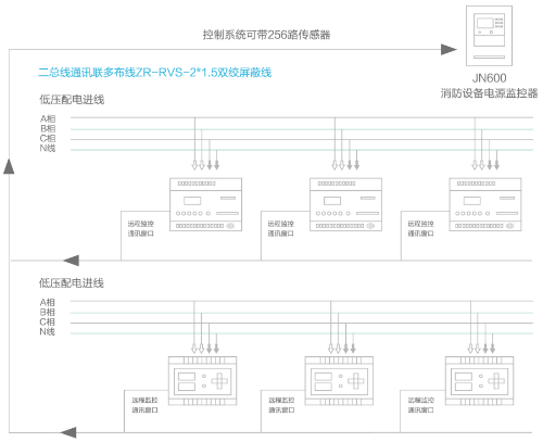 消防設(shè)備電源監(jiān)控系統(tǒng)作為消防聯(lián)動控制系統(tǒng)的必要子系統(tǒng),一般設(shè)置在消防控制中心,由電源狀態(tài)監(jiān)控主機(jī)、監(jiān)控傳感器(包括電壓傳感器、電流傳感器、電壓/電流傳感器等全部或部分組成)及系統(tǒng)總線組成。整個監(jiān)控系統(tǒng)功能全面,安全可靠,探測準(zhǔn)確,性價比高,系統(tǒng)內(nèi)部采用RS485網(wǎng)絡(luò)通信,對外提供Modbus-RTU通信協(xié)議,以滿足其他標(biāo)準(zhǔn)系統(tǒng)連接。
